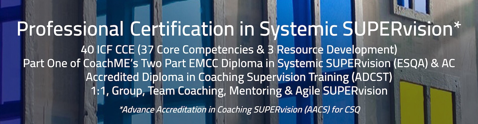 This programme is the foundation of the CoachME Postgraduate Level Diploma in SUPERvision when successful completion provides the designation of CoachME SUPERvisor (CMS). The Diploma is an ESQA programme through EMCC. Full details of the Diploma can be found here: